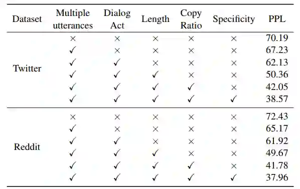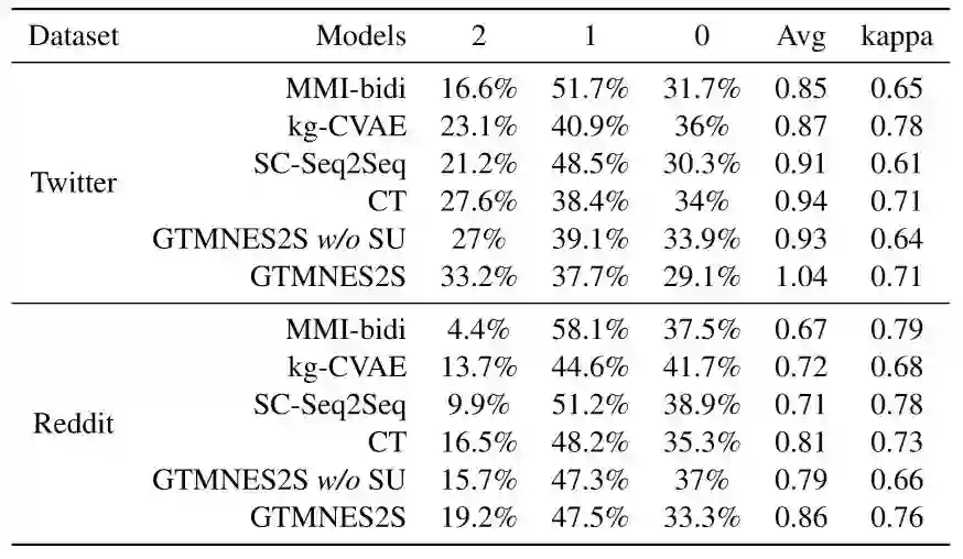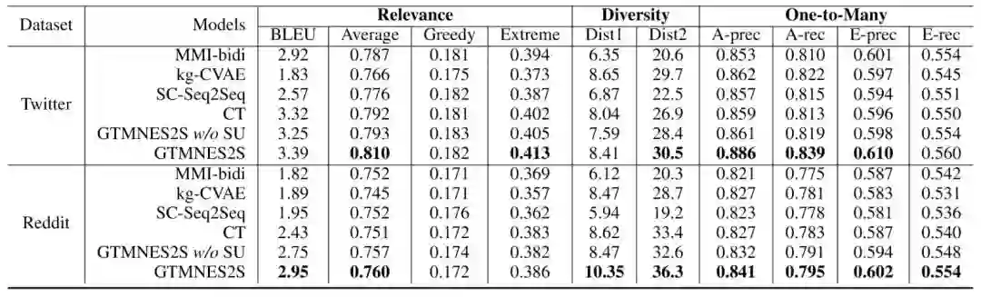 我们在Twitter和Reddit两个数据集上考察了生成回复的相关性、多样性、“一对多“关系建模的准确性、以及meta-word表达的准确性。不仅如此,我们还对生成结果进行了人工评测。实验结果如下: