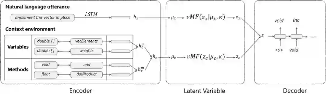 图9是基于上下文的检索模型,该模型是一个建立在变分自编码器(VAE)框架下的编码-解码(encoder-decoder)模型,将文本和上下文环境编码成一个潜层变量z,然后利用该变量解码出逻辑表达式。在检索的过程中,使用KL散度作为距离度量得到相似的样本。