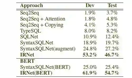 实验结果如表10所示,在Spider数据集上,IRNet实现了46.7%的准确率,比已有的最好方法提升了19.5%的准确率。同时,IRNet+Bert实现了54.7%的准确率。