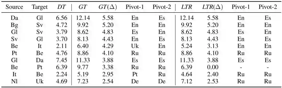 我们在20个语言一共294个语言对上进行了实验,来验证我们的无监督中转翻译以及LTR路径选择算法的性能。表11列出了部分语言对的实验结果,其中DT代表直接从源语言到目标语言的无监督翻译,LTR代表我们提出的中转算法,GT(Ground Truth)代表最好的中转翻译,也决定了我们方法的上限,GT(∆)和LTR(∆)分别代表GT和LTR相对于直接翻译DT的提升,Pivot-1和Pivot-2代表中转路径的两个中转语言(我们最多考虑三跳路径)。如果是一个两跳路径,那么Pivot-1和Pivot-2相同;如果是直接翻译,那么Pivot-1和Pivot-2为空。