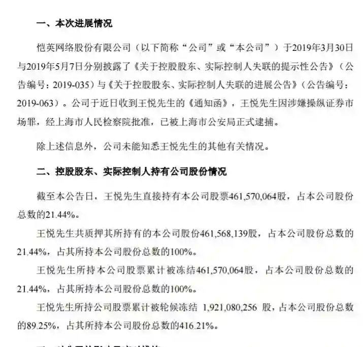 公告显示,王悦直接持有恺英网络股票4.6亿多股,占比 21.44%,以上股份几乎全部被质押,100%被冻结。