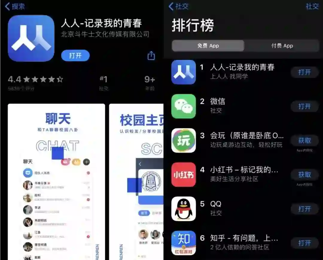 与此同时,在App Store社交排行榜上,人人网力压微信、QQ、小红书等一众同类社交(社区)产品,时隔多年再次登顶应用商店排行榜首位。