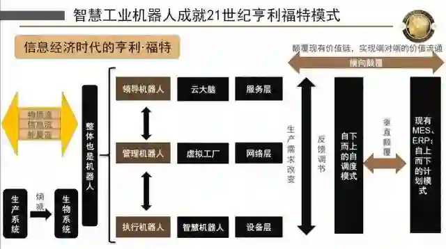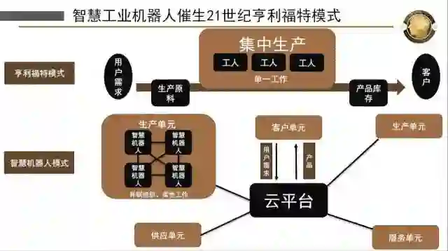一旦我们有了智慧机器人就形成了分布式的网络,这样我们在中国制造2025就可以向工业4.0迈进了。我们现在是个性化的生产,每个人有自己要的汽车,原先那种流水线的方式已经不适合了,我们用分布式的网络来做。一个机器人本身可以完美地干他应该做的事,完全是自组织的,中间没有任何的连接,你告诉他怎么连就怎么连,这样把原来的集中式生产,变成了个性化、柔性化的生产。