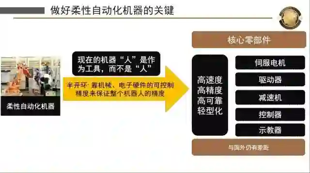 国外机器人在国内仍占主导地位,我们为什么跟国外还有差距呢?机器人关键在于控制每个关节的电机,电机背后是编码器,反馈回来控制它的活动,所以在电机内如果有误差是可以克服的。