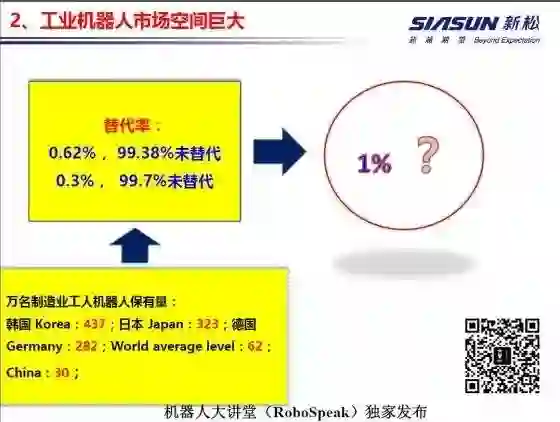 第二 机器人的市场空间巨大。中国机器人替代率只有0.3%,99.7%还是人力在作业。这标志着,如果我要替代一个点,就是几百万台的销量。发展半个多世纪,全球也就0.5%,连1%都没到,只要我们向前迈一个点,就是百万台的市场。