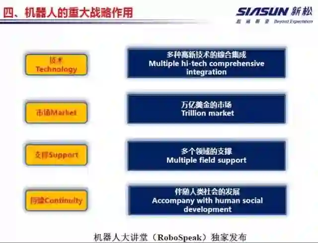第一 从技术层面来说,机器人是多种高新技术的综合集成,机器人的发展水平成为一个国家整体高新技术发展的综合标志;第二 市场,美国麦肯锡预测未来几年机器人具有万亿美金的市场,是一个巨大的产业;第三 支撑,它支撑整个制造模式的变革,改变战争模式,并且还可颠覆我们日常的生活方式;第四 持续,随着机器人的发展,机器人未来会越来越重要,涵盖人类社会的发展,陪伴我们人类社会一直持续下去。