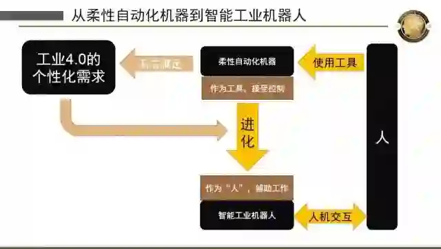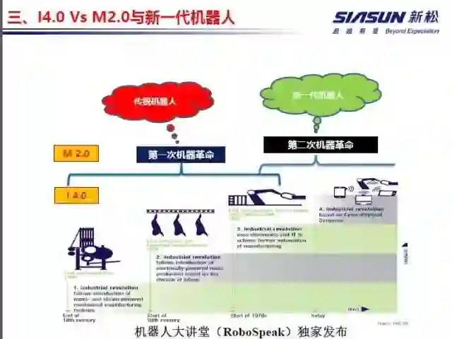 I4.0指工业4.0,跟三次工业革命相对应的,因为工业里面需要机器设备;M2.0指第二次机器革命,几乎前三次工业革命都是第一次机器革命,这时候的机器是真正的机械、机器设备,没有智能,到今天开始我们进入到第二次机器革命,机器的智能化,所以这个是一个巨大的变化。而真正的第四次工业革命需要新的机器人来支撑。
