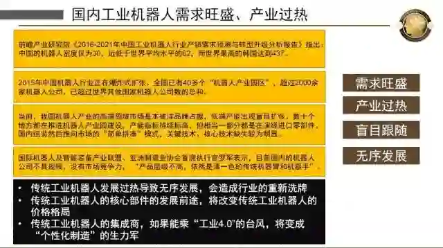 智能工业机器人极容易做,中国跟国外比也是并肩的,还没有取得先进的优势。如果我们开辟新战场,中国人有可能在这个工业领域占据一席之地。