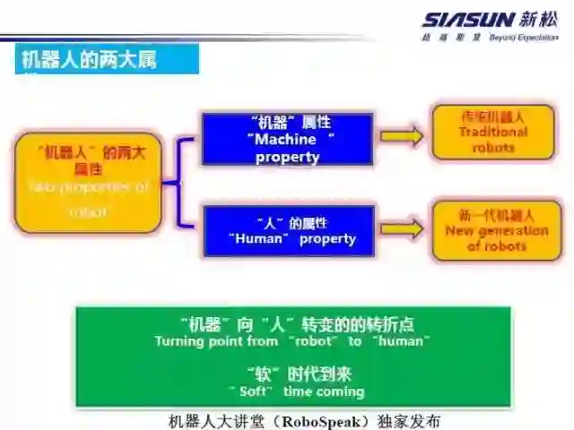 前50年机器人重点是在机器属性上,作为高端机器设备致力于在速度、精度、负载上往前发展,我们称之为传统的机器人。今天更多的研究人的属性,人们更多的把人的形象、智慧、智能和灵活性、灵巧性加入进去。另外,“软”时代的到来,使我们更多的在谈论机器人的适应能力、感知能力,和它的智慧智能。