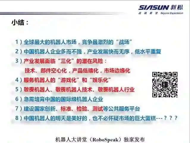 做一个小结,机器人的重新定义开辟了机器人的新时代,机器人由过去的工业机器人已经渗透到人类活动的各个领域,使机器人未来发展空间巨大。传统机器人,从技术上讲已经走到尽头,但其产品还会有持续一段时间。为什么?中国的制造业跟国外相比有一定的滞后。现在我们正处在新旧交替的转折点。