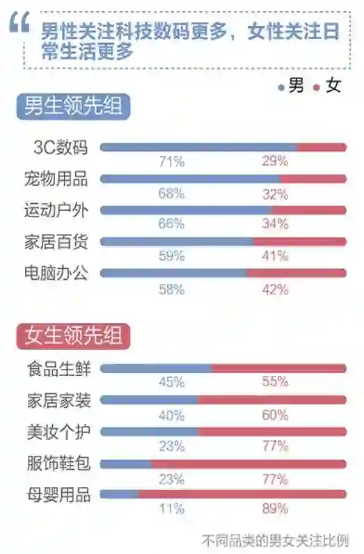 从细分用户属性看,不同性别对于消费品类关注度也有着显著差异。比如3C数码、运动户外等类别的男性关注度更高;而食品生鲜、服饰鞋包等类别的女性关注度则更高。有趣的是,在“猪肉价格”关注度上,男性用户反而占了近8成。