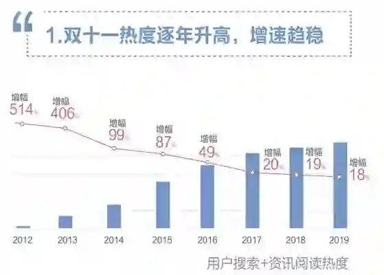 日前,百度发布的《百度2019双十一大数据报告》,全方位复盘了今年网民在“双十一”出现的一些趋势特点。数据显示,2019年,“双十一”走到了第11年,网友对购物节的热情仍没有衰减。过去11年,“双十一”的用户关注度持续攀升,但是增速趋于平稳。