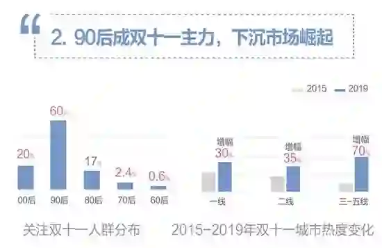 另外,90后用户数量占60%,是“双十一”电商大战的核心“输出”。在职场立稳脚跟的90后,既有一定消费能力,又具备超前的消费观,自然成为了当下“双十一”不可或缺的消费支柱。