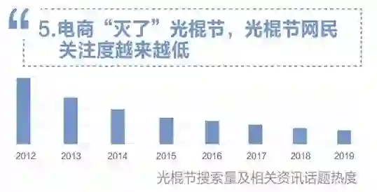 报告显示,“购物津贴”、“店铺优惠”、“凑单满减”、“预售定金”等登陆今年“双十一”购物相关搜索热词。随着购物狂欢重新定义了“双十一”,“光棍节”的关注度正在连年下降,人们记住了购物节,而逐渐忘记了“光棍用购物安慰自己”的初心。