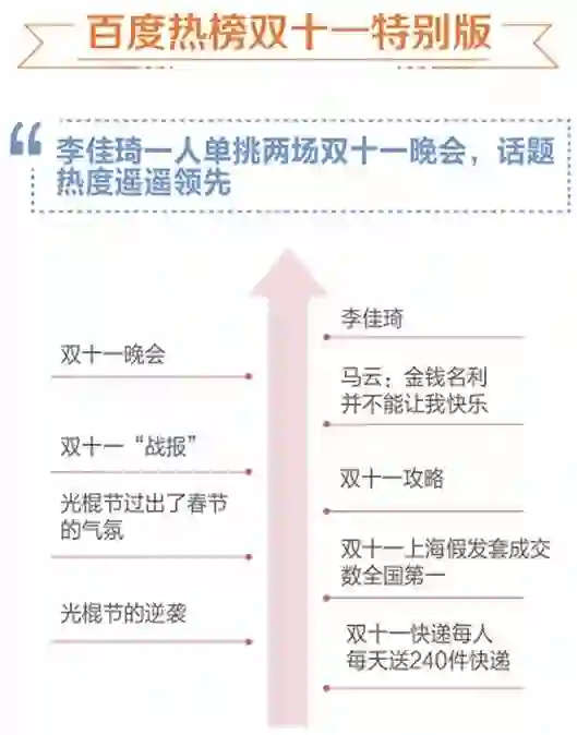 报告显示 ,“李佳琦”相关话题成功跻身2019“双十一”百度热榜TOP1,甚至超过“双十一晚会”。百度热榜是百度App上的热点事件榜单,依托百度搜索及信息流数据统计形成榜单排名,能够真实且迅速的反映网络话题在一段时间的流量热度。