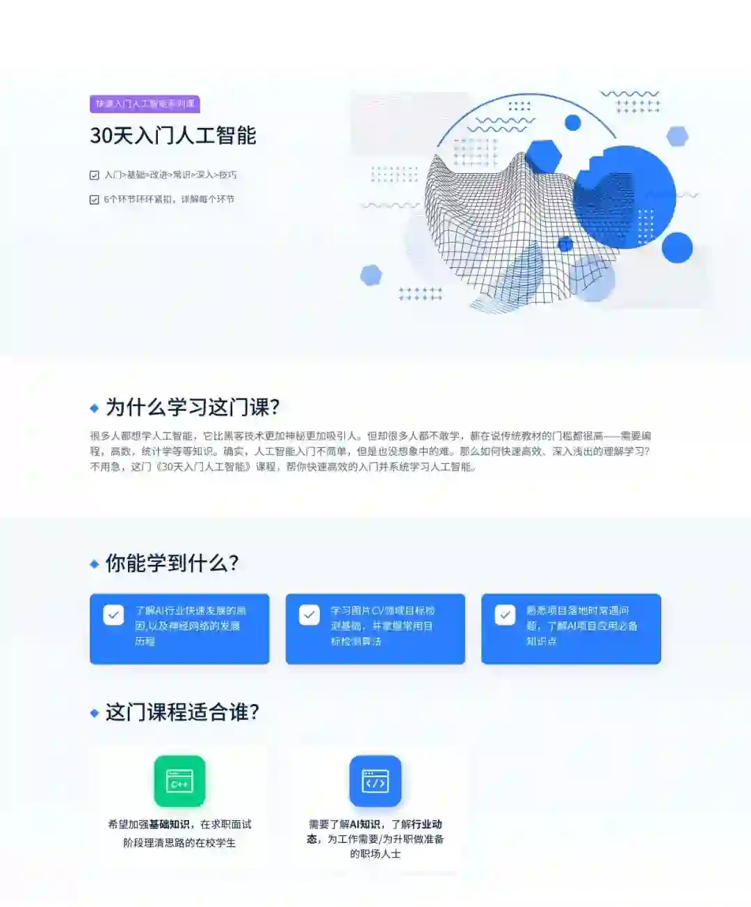 帮助大家真正从0到1快速入门,掌握AI主流技术体系与了解行业全局。