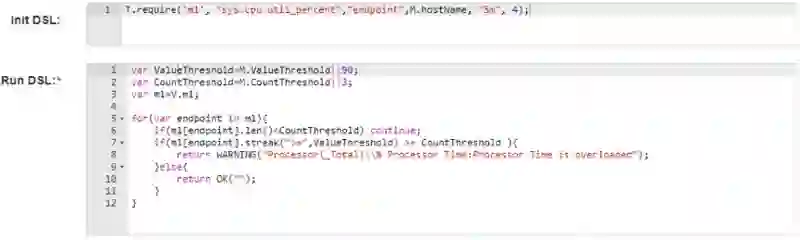 在用户使用方面,Hickwall 提供了基于 JS 语法的 DSL 语言,Init DSL 负责数据的订阅和接收到数据后的处理工作,提供了 groupBy、filter、exclude、summarize 等流式计算中常见的数据处理函数,Run DSL 负责具体的告警逻辑,判断是否有异常。