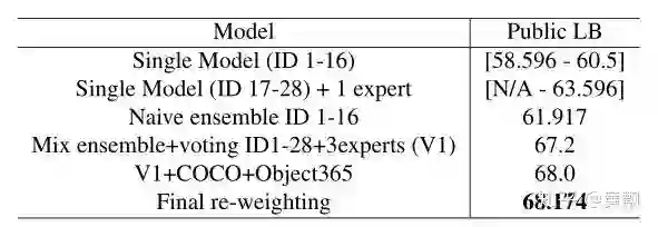 很多大型比赛的固定策略“Ensemble",已经不奇怪了。naive ensemble的策略是借鉴的2018年的OpenImage第二名,给定bounding boxes(P),以及topk个与之IOU较高的候选框,依据验证集的分数来分配各个模型在集成时的权重,这里还分各个目标类别,然后进行加权: