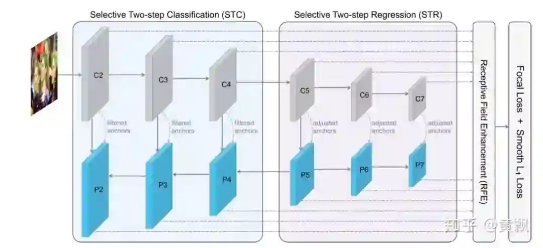 可以看到整体框架很像,但是却有所不同,SRN框架包含有STC+STR+RFE三个模块。其中STC模块作用于浅层网络,用于过滤掉大部分的负样本,STR作用于高层特征,用于粗略调整anchor,类似于RefineDet。而RFE则是在接受各个尺度特征的同时,利用非正方形的卷积核对感受野进行增强(考虑到人脸不一定是正的)。
