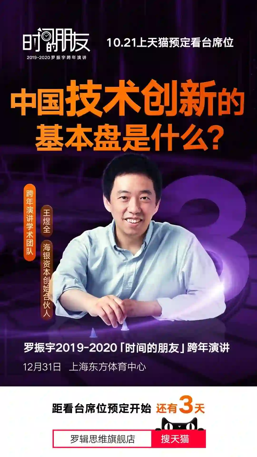 罗振宇2019-2020“时间的朋友”跨年演讲,主题是“基本盘”,我们邀请了海银资本创始合伙人王煜全加入跨年演讲学术团队,帮你看清“中国技术创新的基本盘是什么”。