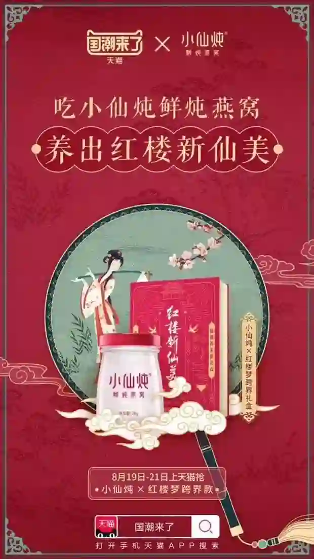 2019年,小仙炖联合天猫国潮行动跨界红楼梦这一经典文化IP,通过线上线下联动打造了一场“红楼新仙美”主题活动。