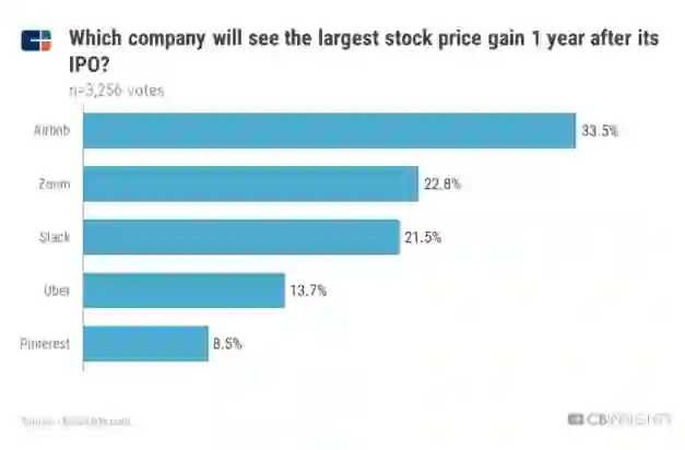 CBInsight要求其订阅者投票决定,他们认为哪家公司将在IPO后一年内获得最大的股价收益。结果如下: