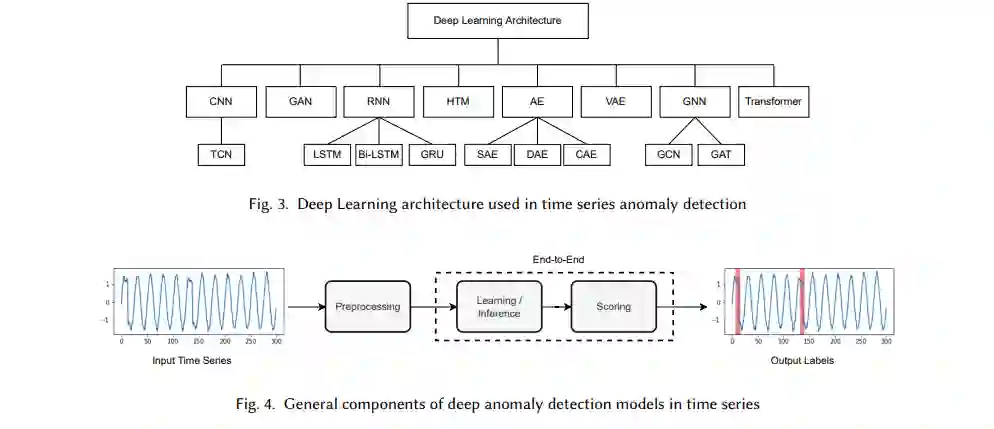 在具有复杂结构的数据中,深度神经网络是建模依赖关系的强大方法。许多学者对其在异常检测中的应用非常着迷,它使用了许多深度学习架构,如图3所示。在实践中,训练数据往往只有极少数被标记的异常。因此,大多数模型试图学习正常数据的表示或特征。然后根据异常定义检测异常,这意味着他们发现了与正常数据不同的数据。在最近的深度异常检测模型中,有四种学习方案:无监督、有监督、半监督和自监督。这是基于标签数据点的可用性(或缺乏)。监督方法采用一种独特的方法来学习异常数据和正常数据之间的边界,该方法基于在训练集中发现的所有标签。它可以确定一个适当的阈值,如果分配给这些时间戳的异常评分(第3.1节)超过阈值,则该阈值将用于将所有时间戳分类为异常。这种方法的问题是它不适用于现实世界中的应用程序,因为异常通常是未知的或标记不正确的。相反,在无监督异常检测方法中,不区分训练集和测试集。这些技术是最灵活的,因为它们完全依赖于数据的内在特征。它们在流应用程序中很有用,因为它们不需要标签进行培训和测试。尽管有这些优点,研究人员可能会遇到困难,评估异常检测模型使用非监督方法。异常检测问题通常被视为无监督学习问题,因为历史数据固有的无标记性质和异常的不可预测性质。在数据集只包含正常点且不存在异常的情况下,可以使用半监督方法。然后,训练一个模型来拟合时间序列分布,并检测任何偏离该分布的点作为异常。通过充分利用未标记数据本身(例如,通过设计文本前任务),训练自监督方法从其可观察部分预测输入的任何未观察部分(或属性)。在自监督学习中,只需要从无监督问题中自动生成少量的标记,因此将无监督问题转换为有监督问题。