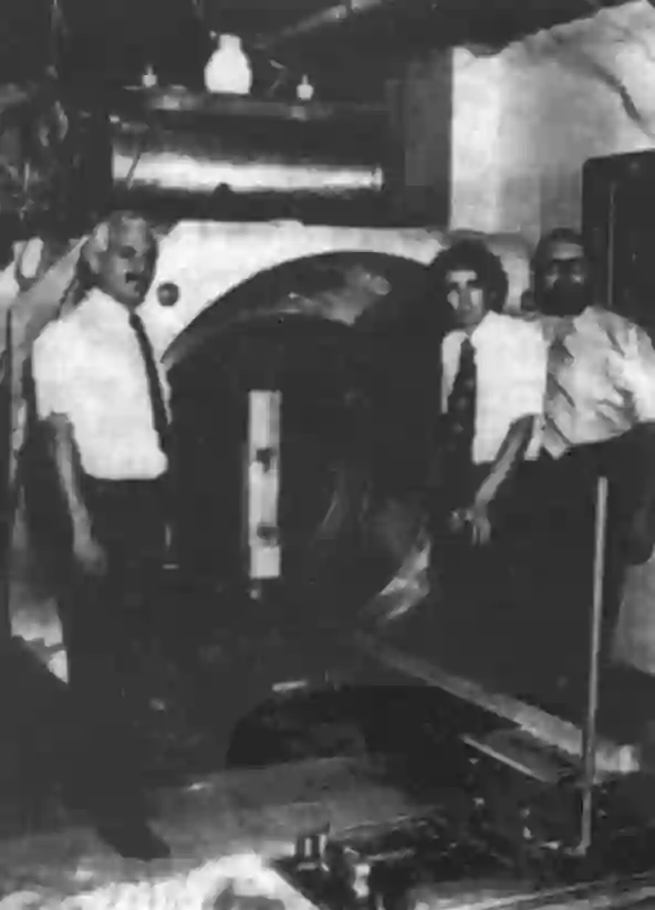 现代核磁共振成像技术在欧洲和美国以独立的技术路线分别开展。欧洲方面:1973年化学家保罗·克里斯琴·劳特伯和物理学家彼得·曼斯菲尔德爵士在荷兰的中心实验室搭建完成了最初的磁共振成像系统(图2),并对充满液体的物体进行了成像,得到了著名的核磁共振图像“诺丁汉的橙子”(图3),拔得磁共振技术成像领域的头筹。