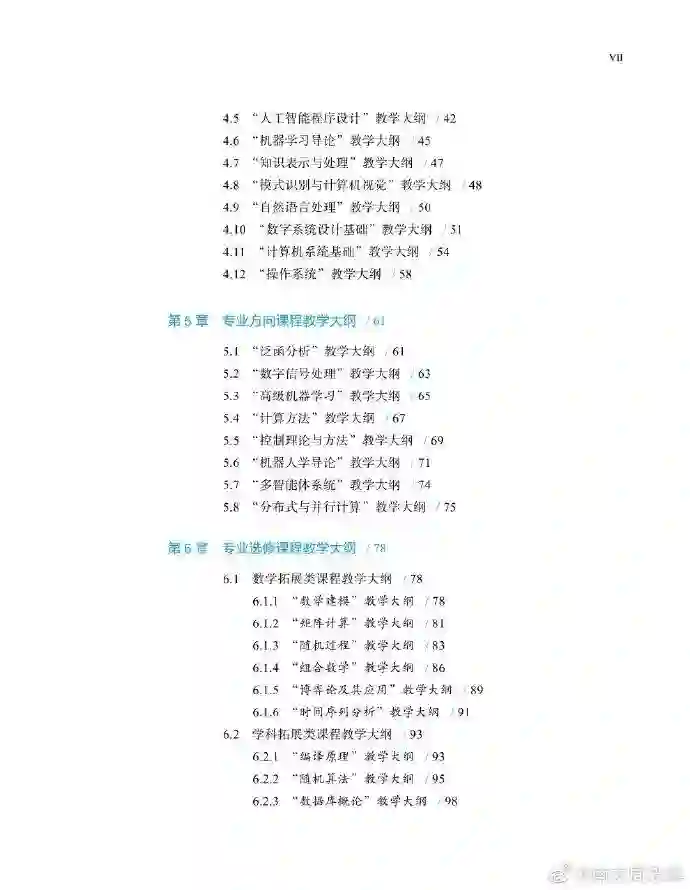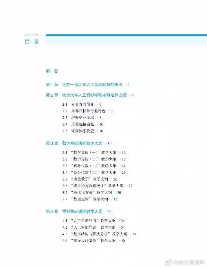 从书目目录来看,《培养体系》的主体内容实际上是由一系列课程教学大纲组成的合集。本书前2章主要介绍对AI本科教育的思考和南大人工智能学院本科培养方案。然后进入主体部分,即课程设置和教学大纲,按课程类别分为数学基础课程、学科基础课程、专业方向课程和专业选修课程(本书3-6章)。