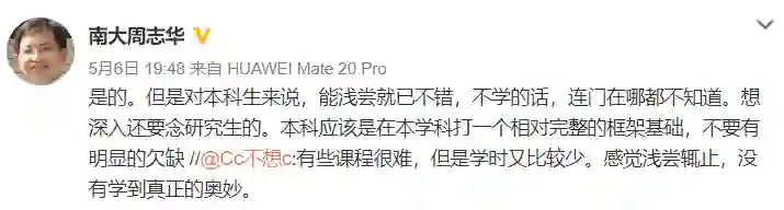对此周志华回应称 ,本科阶段更重要的是学到一个相对完整框架,浅尝就已不错,要想深入还需要读研究生。