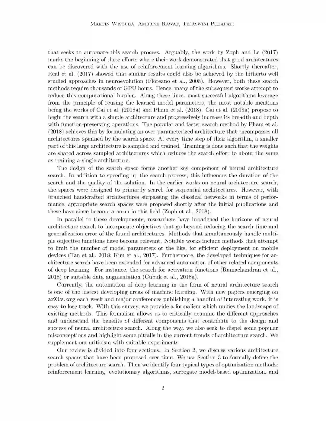 目前,深度学习自动化是机器学习领域增长速度最快的研究方向。每周,在arxiv社区上均会发表大量有趣的信息研究成果,这也让研究人员很难做到完全的跟踪。为此,通过本文,我们对网络架构搜索问题,提供了一种形式化的描述,对现有的技术进行了统一的分类,并对单个技术进行了详细的分析。在本文中,我们讨论了基于强化学习和进化算法原理的常见架构优化算法,另外,我们还讨论了新的研究方向,包括约束和多目标架构搜索,及自动数据增强、优化器和激活函数搜索等。