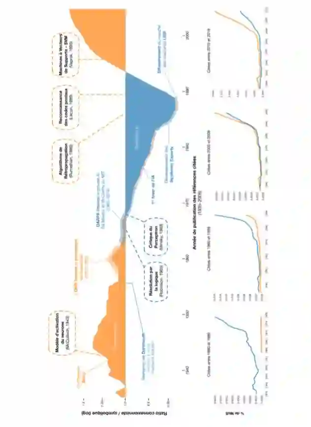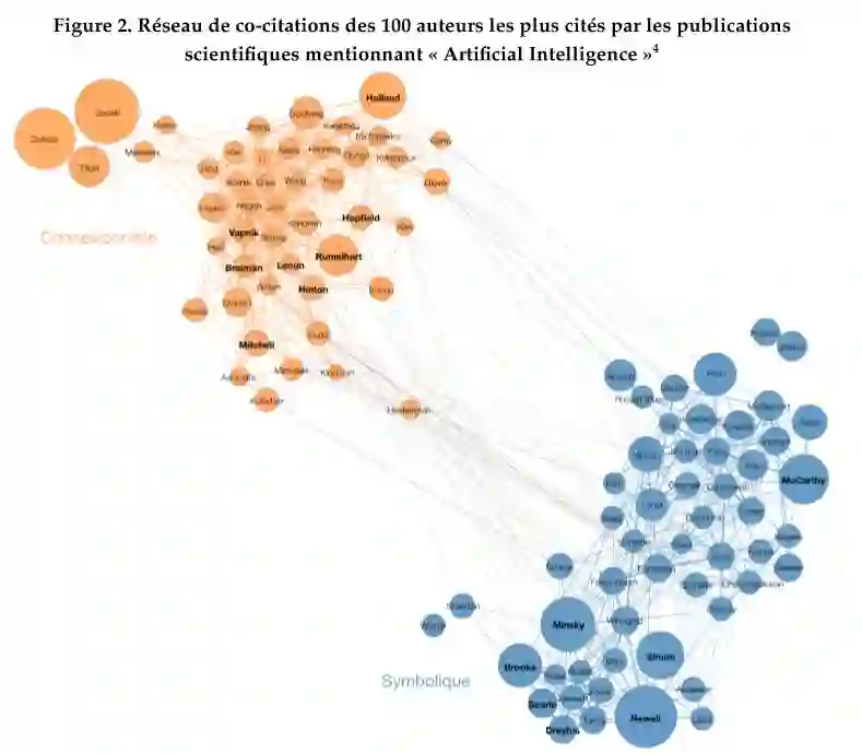 我们可以在图2中看到我们将在本文中将提到的主要人物的名字,他们已经根据不同的科学社区进行了区分。在联结主义社区的中心是 Rumelhart, LeCun 和 Hinton。他们是深度学习的奠基者。他们周围也有很多其他研究人员 (Holland, Hopfield), 还有一些人为传统的机器学习方法作出了极大贡献,如 Breiman, Mitchell 和 Vapnik。在符号主义那边,核心人物如McCarthy, Minsky, Simon et Newell可以看作 AI 的创立者。他们周围也围绕着一群人,如 Dreyfus, Searle, Brooks,他们为认知模型、专家系统等等做出了重要贡献。