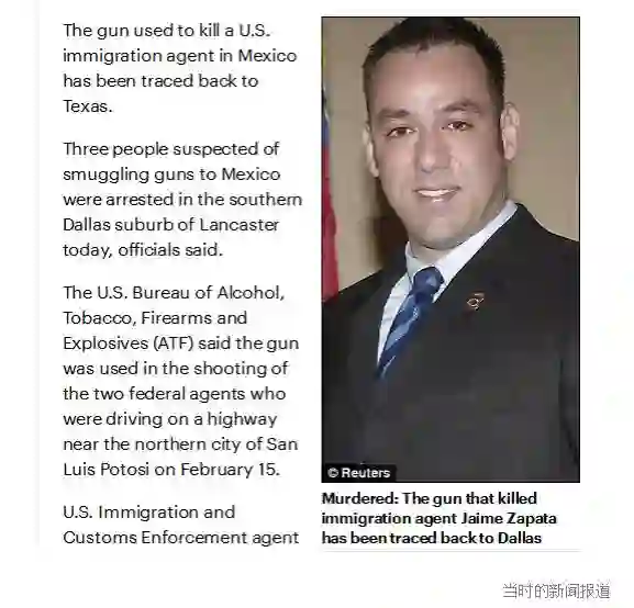 2011年2月15日,美国海关的一名年仅32岁的情报人员杰米· 萨帕塔,在墨西哥的一条高速公路上被一群毒贩射杀。
