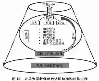角色认同是开放大学教师身处在线开放教育情境,在与开放大学的角色物化形式“主持教师”的角色定位、角色职责、角色能力、行为标准的协商过程中建构的;也是教师在与“管理人员、系统各层级教师、学生、技术及设计人员、外聘学科专家”等实践共同体成员的角色互动中协商“学科专家、教学专家、组织协调者、设计专家、技术专家”等多重角色身份,教师在“资源开发、内容提供、学科教学、教学设计、技术支持、学科及教学研究”等边界性角色实践抉择的过程中社会性建构的,开放大学教师角色认同协商和建构过程见图10。