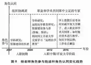“我希望将来熟练掌握了远程教育技术,在课程中能有自己的特色和创造,做出的课程与众不同,这是我的理想!我对这份职业很自豪或者很自信!希望将来参加学术会议,在法学教育职业共同体和学术共同体中有一席之地。我觉得我的共同体在那儿呢!但是我都进不去!想象中你应该是这个团体中的人,但是你怎么在这个团体中游走,好像别人也不认可你是这个圈的。”(访谈资料I-YANG- 她有强烈的危机意识,对自身和同事能否整合技术开展教学、能否在激烈在线教育竞争中立足表示担忧。她比较失落和缺乏职业幸福感,其角色认同持续在较低水平(见图8)。