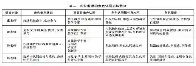 四位教师的角色参与状态、显要性角色认同、角色认同属性及水平、角色情意等总体特征见表二。