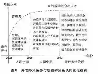 海老师人职初期扮演了组织专家建资源的“管课者”以及网站资源建设者的角色,职业中期开始拥抱在线教育,成为在线学习者和在线辅导教师。他从引进、改造海外在线课程到领衔团队设计、建设和辅导在线课程,目前正深度参与开放大学扁平化、一站式在线教学试点,并在爱课程网面向社会公众开展在线教学。他统整“内容提供者、辅学促学、技术支持、教学设计、团队管理、教学研究”等角色,成为在线教学复合型专家。海老师追梦在线的领跑激情诠释了其越来越高的角色认同和幸福感(见图6)。
