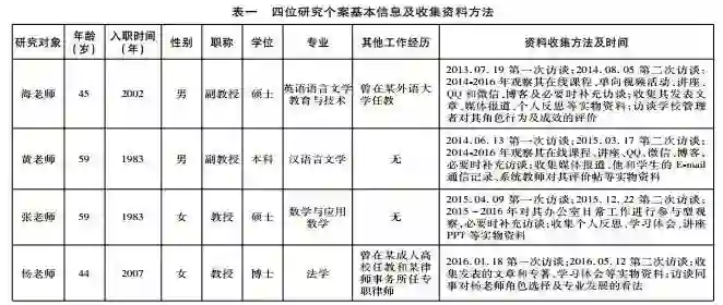 本研究遵循建构主义研究范式,采用质性研究的个案研究法对开放大学教师角色认同建构过程进行实证研究。根据迈克尔•巴顿(Patton,1990)的目的性抽样原则,即“按照研究目的抽取能够为研究问题提供最大信息量的研究对象”,本研究从开放大学总部9位研究参与者中选取资料饱和度较高、可以呈现角色认同丰富类型的4位教师(入职均9年以上)作为研究个案。