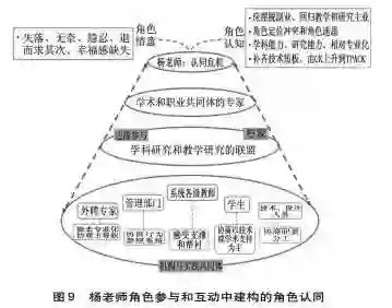 总之,杨老师在角色边缘参与中建构了“学术和职业共同体中的专家”的显要性角色认同;她在与机构和实践共同体互动中协商行为参照系统和学术主导权,与技术人员协商明确职责分工,建构了“学科立足和学术固本”的角色认同(见图9)。