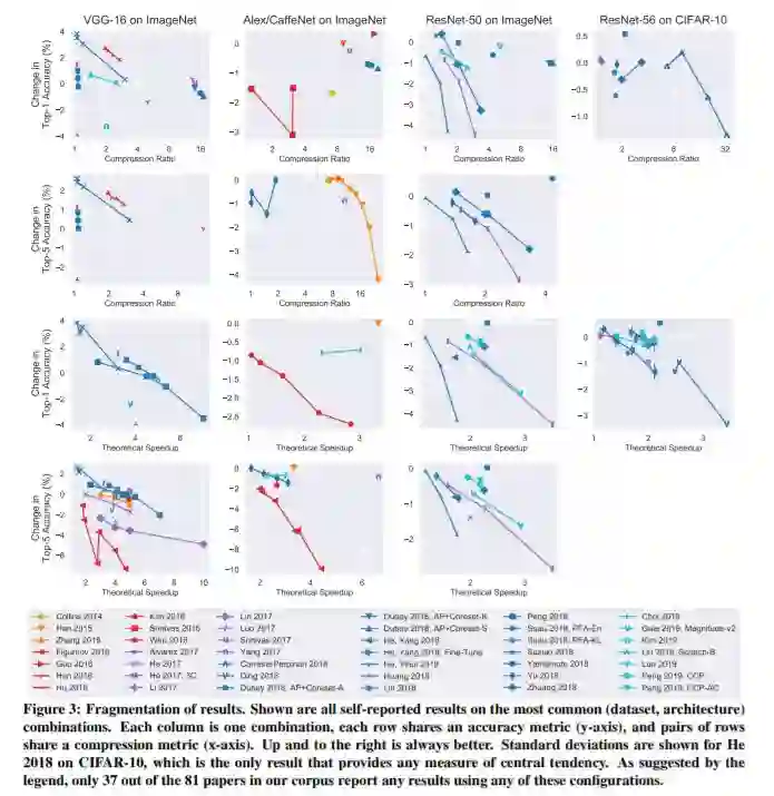 神经网络修剪——通过删除参数来减小网络大小的任务——是近年来大量工作的主题。我们提供了文献的荟萃分析,包括剪枝方法的概述和文献中一致的发现。在对81篇论文的结果进行汇总,并在受控条件下对数百个模型进行修剪之后,我们最明确的发现是,社区缺乏标准化的基准和度量标准。这一缺陷非常严重,以至于很难对修剪技术进行比较,也很难确定这一领域在过去三十年中取得了多大的进步。为了解决这种情况,我们确定了当前实践中的问题,提出了具体的补救措施,并引入了ShrinkBench,这是一个开源框架,用于促进修剪方法的标准化评估。我们使用收缩台对各种修剪技术进行了比较,结果表明,它的综合评价可以防止在比较修剪方法时常见的缺陷。