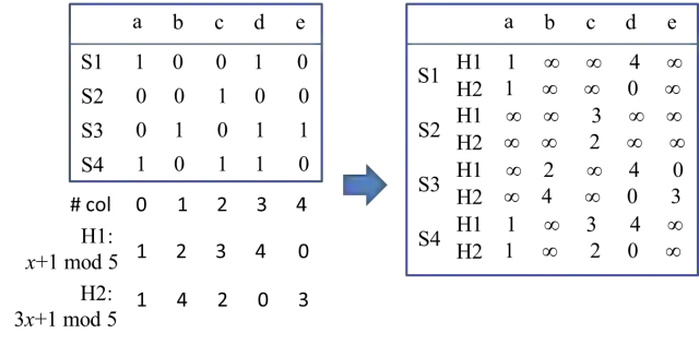 举个例子,我们通过两个hash函数(H1和H2),对step 2中的示例数据进行hash编码,其规则为:按列对数据进行编码,如果对应的字符串中出现该子串(对应位置标注为1),则取对应列的hash编码,否则置为无穷大∞(见图5示例)。