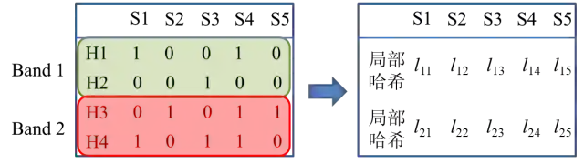 图 6 在minhashing基础上的局部敏感哈希示例