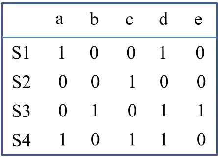用一个简单的例子展示该步骤。我们取1-shingle情况,对4个字符串(“ad”,“c”,“bed”,“adc”)进行切分(step 1操作),得到集合S1={a,d}, S2={c}, S3={b,d,e}, S4={a,c,d}。则标注后的数据为