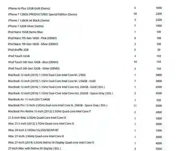 但为时3天的清仓营销,店家只提供了不到200个产品。标价人民币3600元的iPhone7 (128G)只有19个;标价人民币50元只有的 ipod shuffle(2G)只有5个;笔记本电脑的折扣也不小,Macbook Pro retina(2012)需要4500人民币左右,甚至7300元左右就能买一个2016年款的Macbook。但800元左右就能买一个的Macbook Air (64G 2011)只有1个。