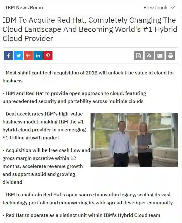 28 日,IBM 宣布收购 Linux 巨头 Red Hat。公告中称,两家公司已达成最终协议,根据该协议,IBM 将以每股 190 美元的现金收购 Red Hat 所有已发行股份,总价值约为 340 亿美元(约 2360.45 亿人民币)。