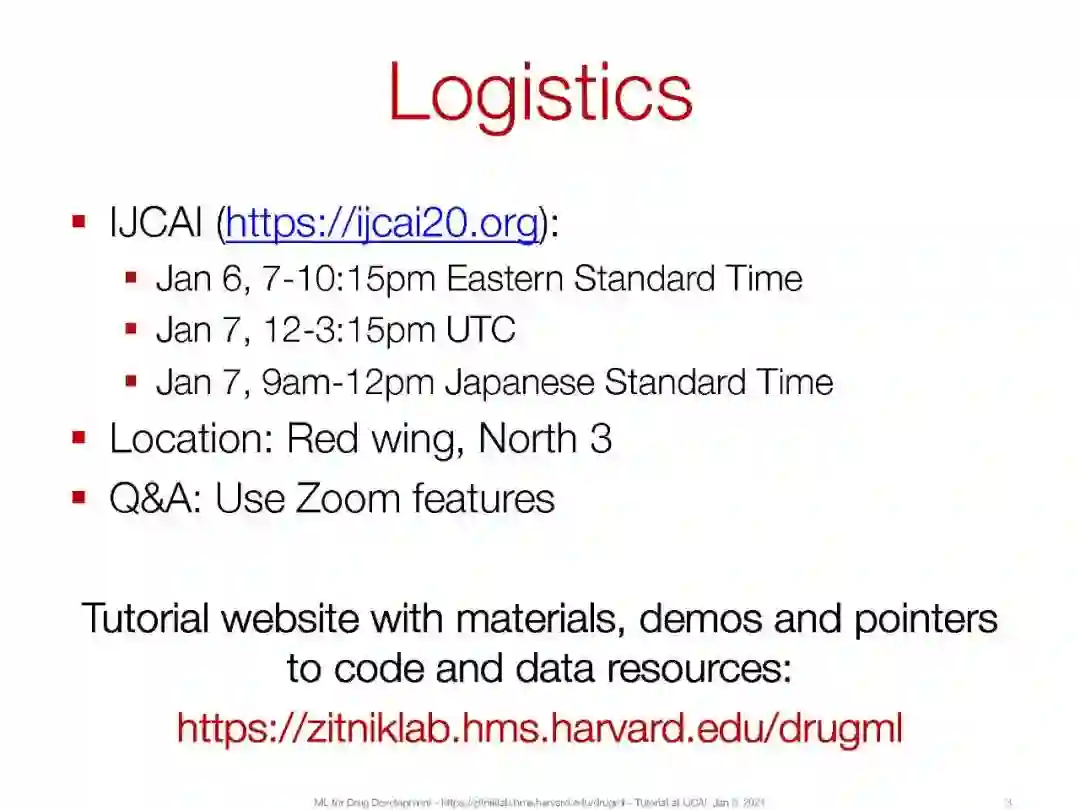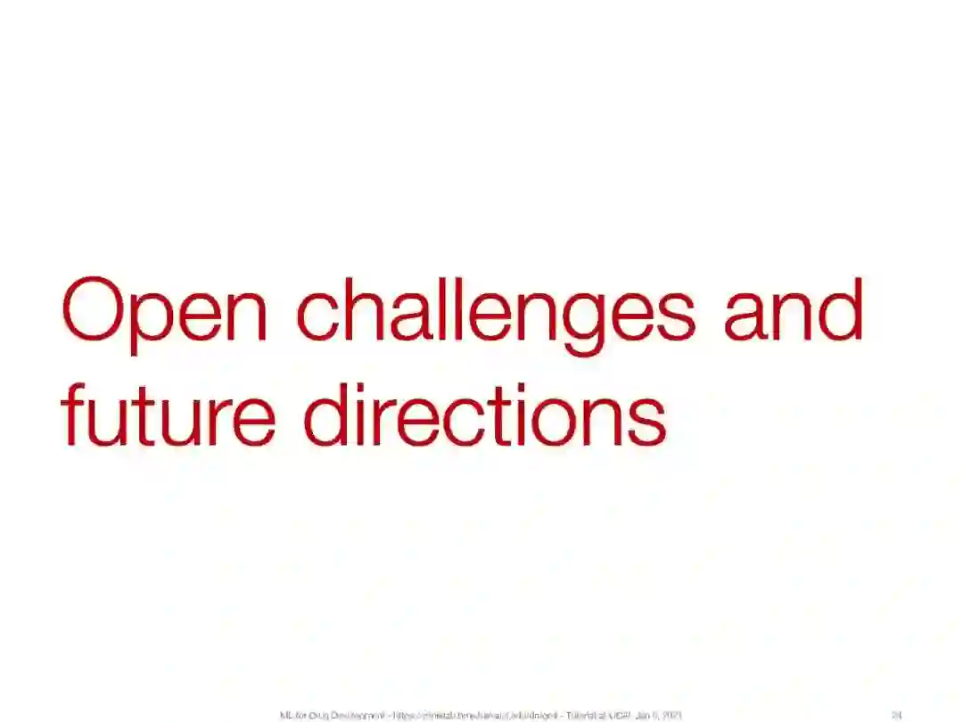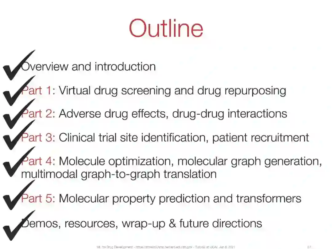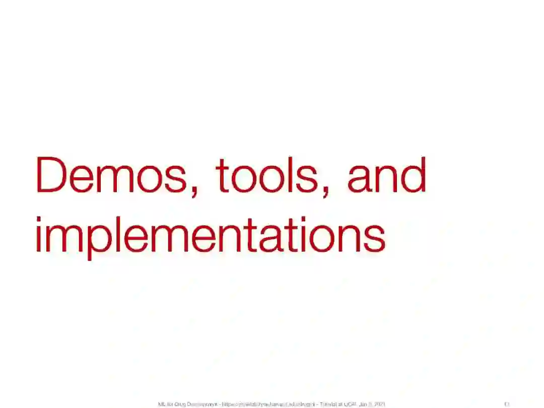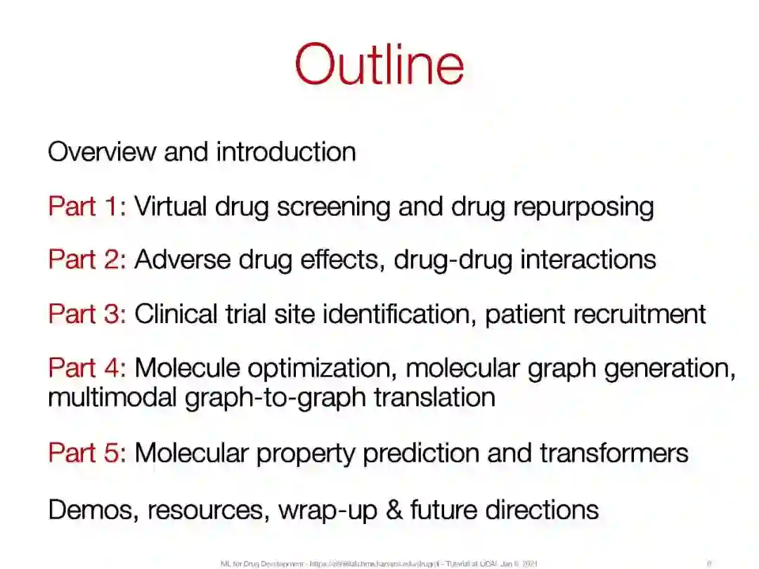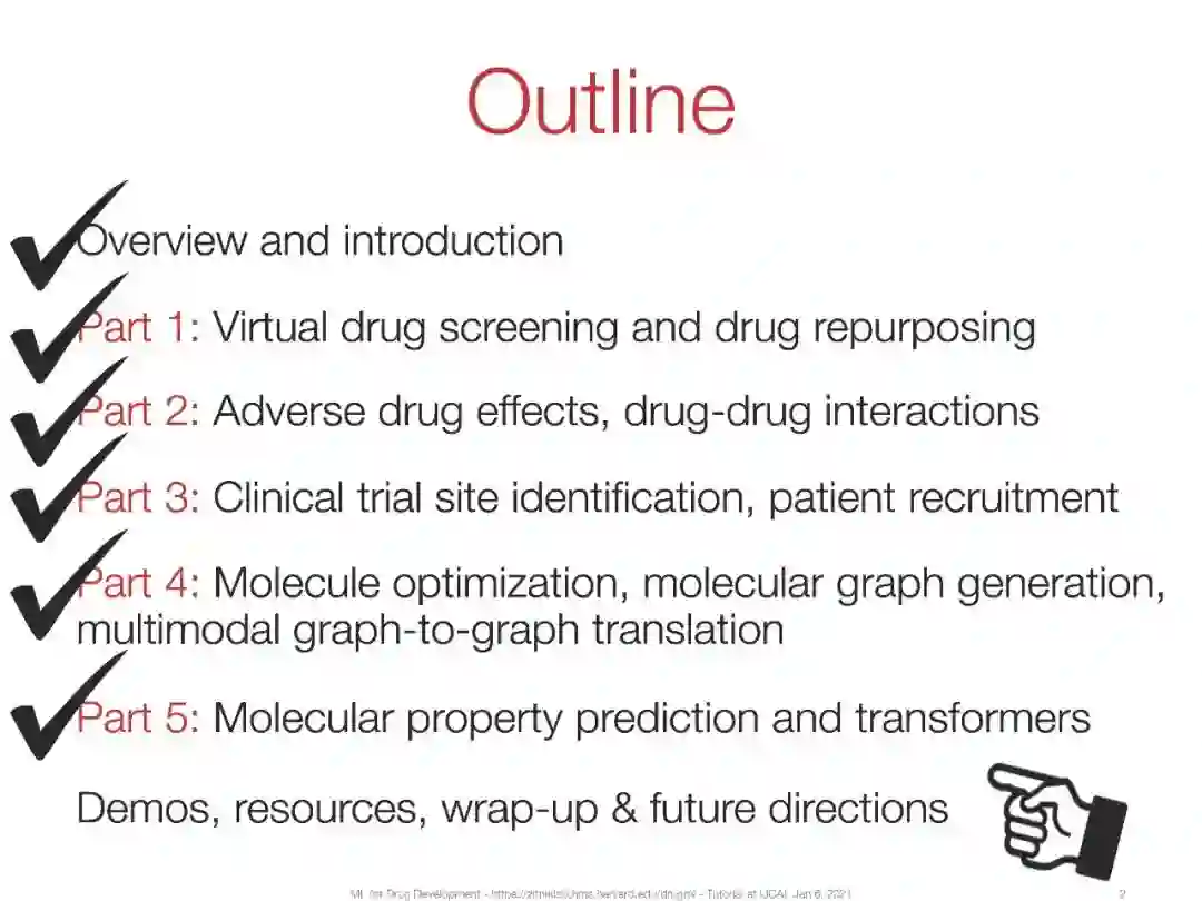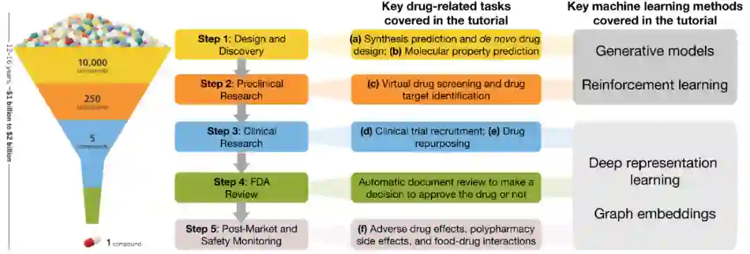 在本教程中,我们将介绍机器学习在过去几年中取得的关键进展,并强调这些进展在药物开发中带来的根本性的新机遇。我们感兴趣的是这些进步为什么以及如何帮助完成与药品有关的任务。我们通过六个关键任务详细阐述了机器学习在药物开发中的应用:(a)合成预测和新药设计,(b)分子性质预测,(c)虚拟药物筛选和药物靶标相互作用,(d)临床试验招募,(e)药物再利用,(f)药物不良反应和多用药。
