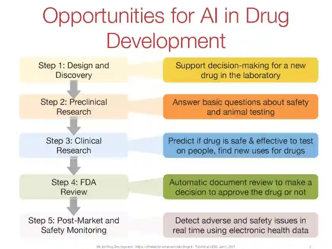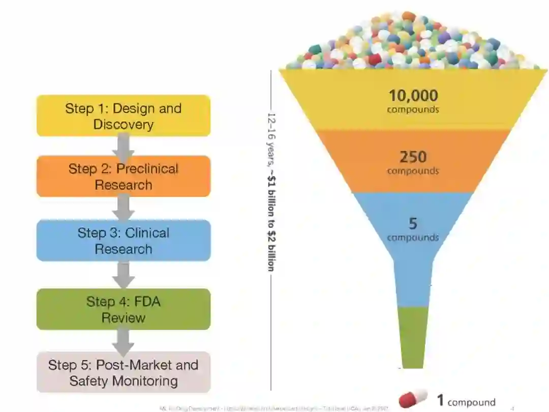 药物的发现和开发是一个漫长而昂贵的过程。它通常从分子和目标的实验发现开始(即药物从头设计),并在转入临床试验之前通过细胞系、类器官和动物的体外实验验证发现。一种新药从发现到监管机构批准的整个过程可能需要长达12年,成本高达28亿美元。此外,每个药物开发阶段都存在巨大的不确定性(1:50 000的成功率)。