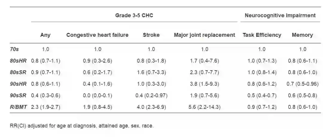 在6148名生存者中(中位年龄31.5岁),15年全因死亡率为5.8%(95%CI 5.3~6.2),HRM为1.5%(95%CI 1.2~1.7)。与70s组比较,90sSR和90sHR组的HRM更低(RR 0.1, 95%CI 0.0~0.3; RR 0.2, 95%CI 0.1~0.7),与美国人群相似(SMR; 95%CI: 90sSR 1.1, 0.6~1.9;90sHR 1.9, 0.8~3.7)。20年SN的累积发生率为3.5%(95%CI 3.1~3.9)。与70s组比较,90sSR发生良性脑膜瘤(RR 0.1, 95%CI 0.0~0.3),SMN(RR 0.3, 95%CI 0.1~0.6)的风险更低,与美国人群比较,风险没有绝对增加。90sSR发生CHC的风险较低。