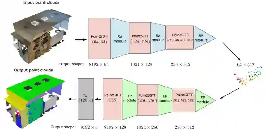 pointSift模块作为一个通用提高表征能力的模块,可以灵活地嵌入在各种pointnet框架中,比如下图所示。