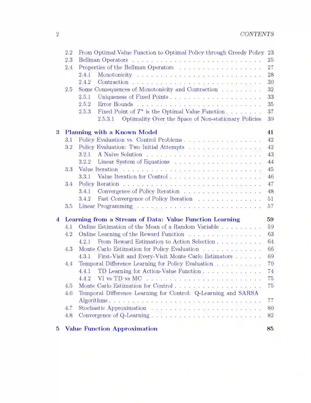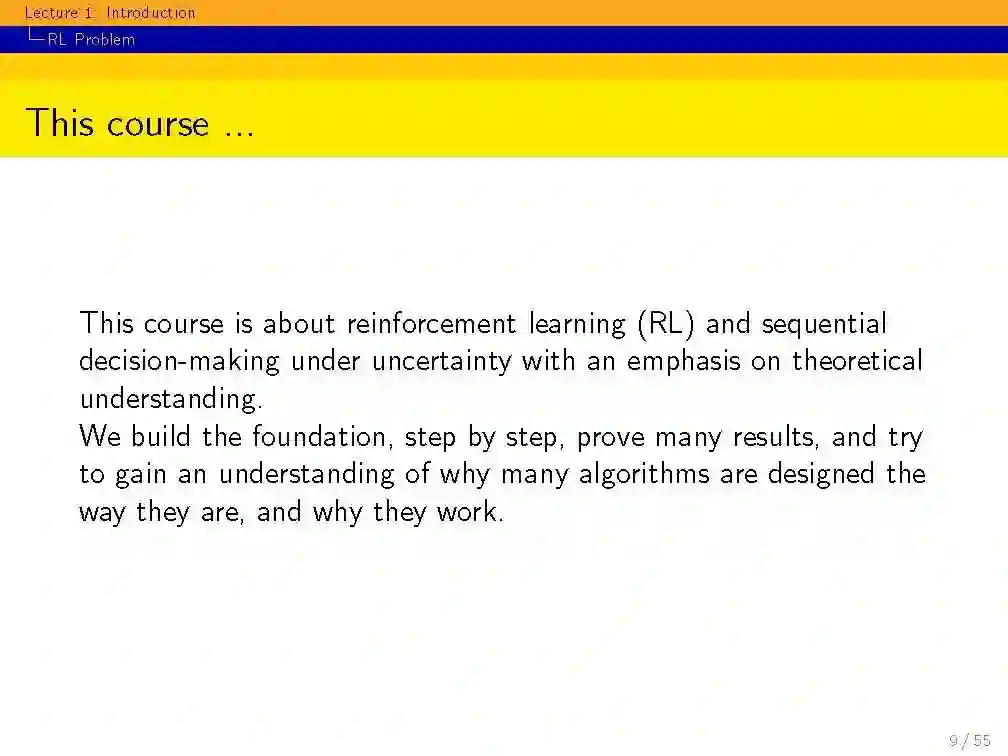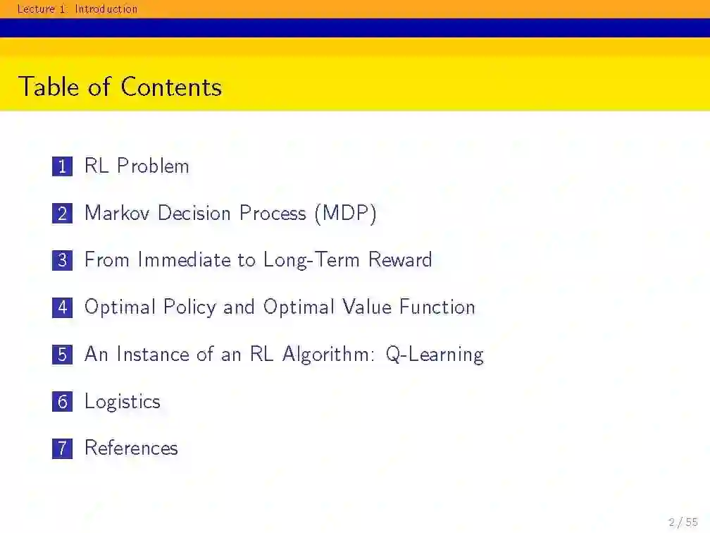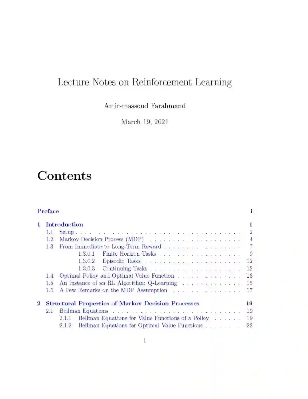 这是多伦多大学计算机科学系于2021年春季教授的强化学习(RL)研究生课程介绍的讲义。本课程是入门性的,因为它不需要预先接触强化学习。然而,它不仅仅是算法的集合。相反,它试图在RL中经常遇到的许多重要思想和概念背后建立数学直觉。在这些讲义的过程中,我证明了很多基础的,或者有时不那么基础的,RL的结果。如果某个结果的证明过于复杂,我就证明一个简化的版本。
